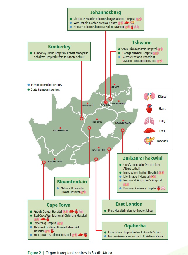 Graphic of transplant centres in South Africa. (Source: Organ and Tissue Donation in South Africa – Creating a National Strategy Roadmap)