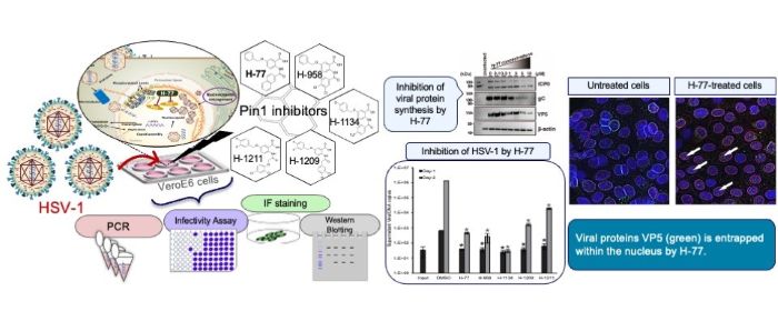 In laboratory tests, the Pin1 inhibitor H-77 and the four newly developed Pin1 inhibitors successfully stopped the replication of HSV-1. VeroE6 cells, derived from the kidney of an African green monkey and commonly used in virology research, were infected with HSV-1 and cultured in the presence of different amounts of a Pin1 inhibitor. As the amount of the inhibitor increased, the effects of HSV-1 on the cells became less pronounced and completely disappeared at 1 μM. They also found that any viral particles released from the treated cells were non-infectious.